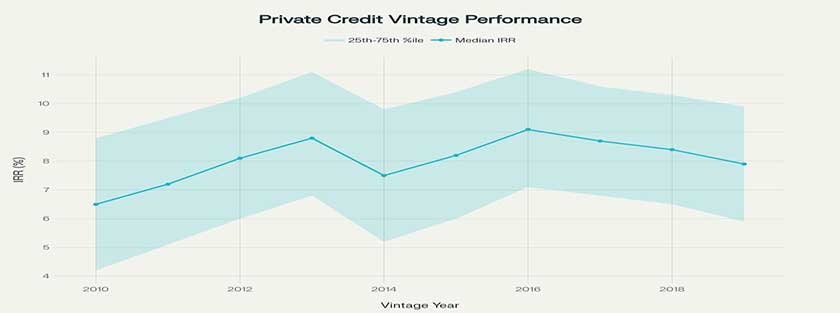 Historical analysis reveals that private credit has achieved positive returns in every vintage year over the past 23 years, demonstrating exceptional consistency across market cycles. The performance distribution shows relatively tight bands around median returns, indicating lower dispersion compared to other private markets strategies.