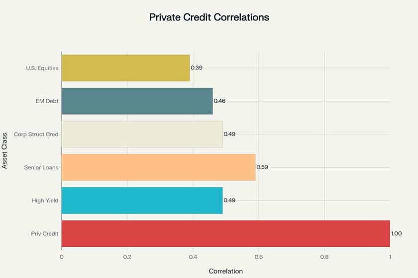 Diversification Benefits: Private credit exhibits low correlation with traditional asset classes (0.39 with equities, -0.02 with investment grade bonds), providing excellent portfolio diversification.