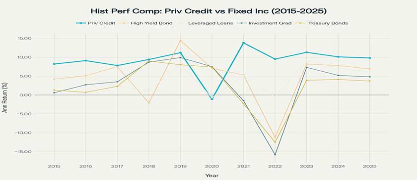 Historical performance comparison showing private credit’s superior and more consistent returns compared to other fixed income asset classes over the past decade.