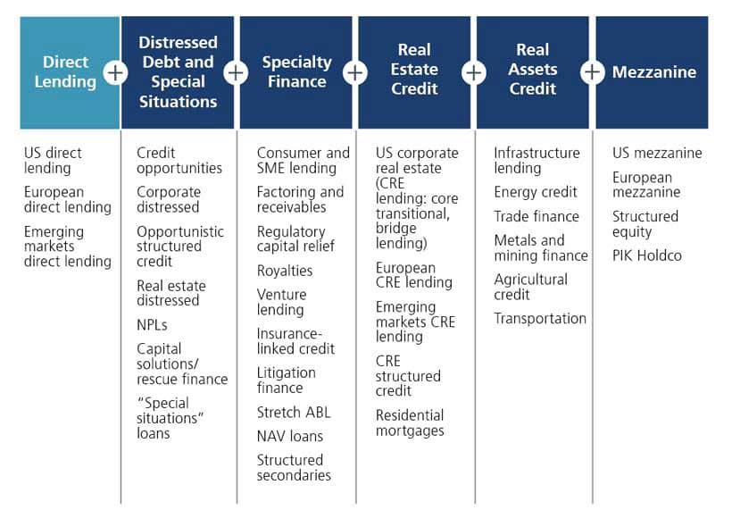 Overview of various private credit categories, including direct lending, distressed debt, specialty finance, real estate credit, real assets credit, and mezzanine.