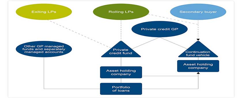 Flowchart illustrating the structure and process of private credit continuation funds and direct lending investments.